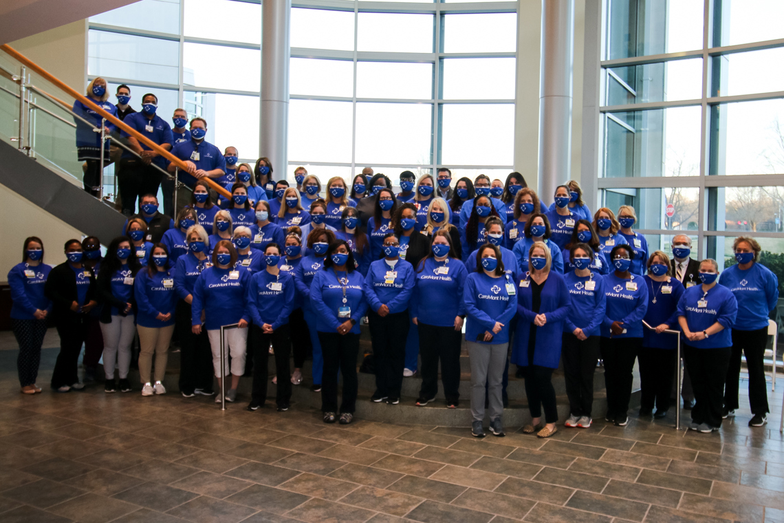 The COVID-19 Vaccination Team at CaroMont Health gather for a photo before administering the first of over 5,000 doses of the COVID-19 vaccine to eligible individuals during the three-day mass vaccination event.