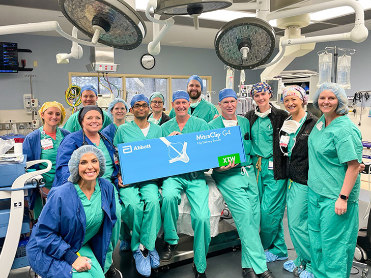 Led by Dr. John Schindler, Dr. Pratik Patel and Dr. James Greelish, a surgical team at CaroMont Regional Medical Center performed the hospital’s first transcatheter mitral valve repair on February 21, 2023. Using the MitraClip, the surgeons were able to repair a damaged mitral valve in a patient for whom traditional valve repair surgery was not an option.