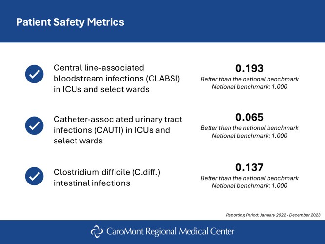 CaroMont Regional Medical Center is committed to providing the highest quality medical care with a focus on patient safety. Ensuring all hospitals are aligned under the goal of zero preventable harm, the following metrics are continuously monitored to ensure the health system is providing compassion, exceptional and highly reliable care.
